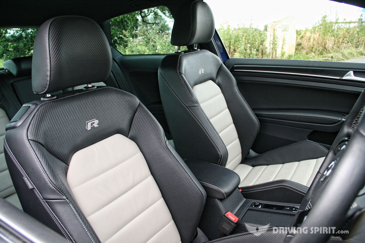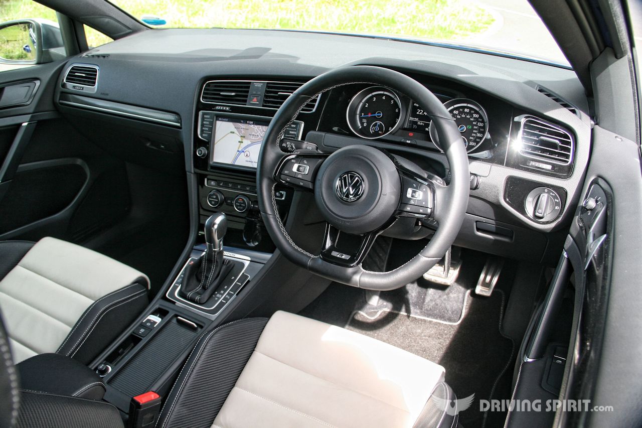 It’s the same on the inside. Cream and black leather seats and carbon-fibre effect dash and door trim can’t hide the R’s humble origins. Mind you, I say ‘humble’, but the Golf’s cabin is probably the best in class thanks to its quality feel and perfect ergonomics.